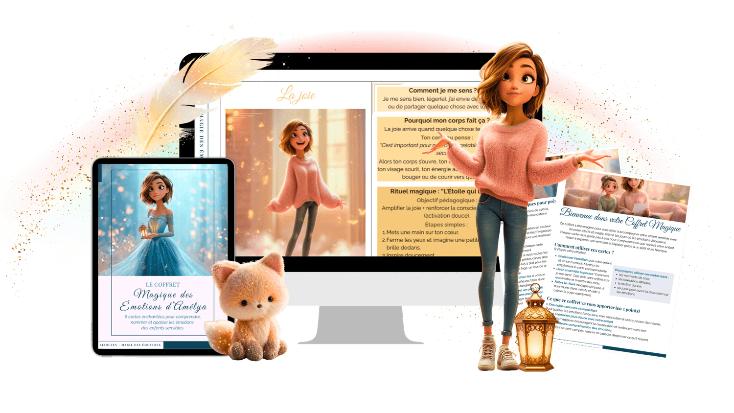 Il vous suffit d’indiquer votre prénom et votre adresse mail, et vous recevrez immédiatement le Coffret Magique des Émotions d’Amélya. En quelques minutes, vous accéderez à 6 cartes simples et douces pour apaiser les émotions de votre enfant avec plus de sérénité. Vous êtes littéralement à un clic d’un quotidien plus calme et plus fluide.